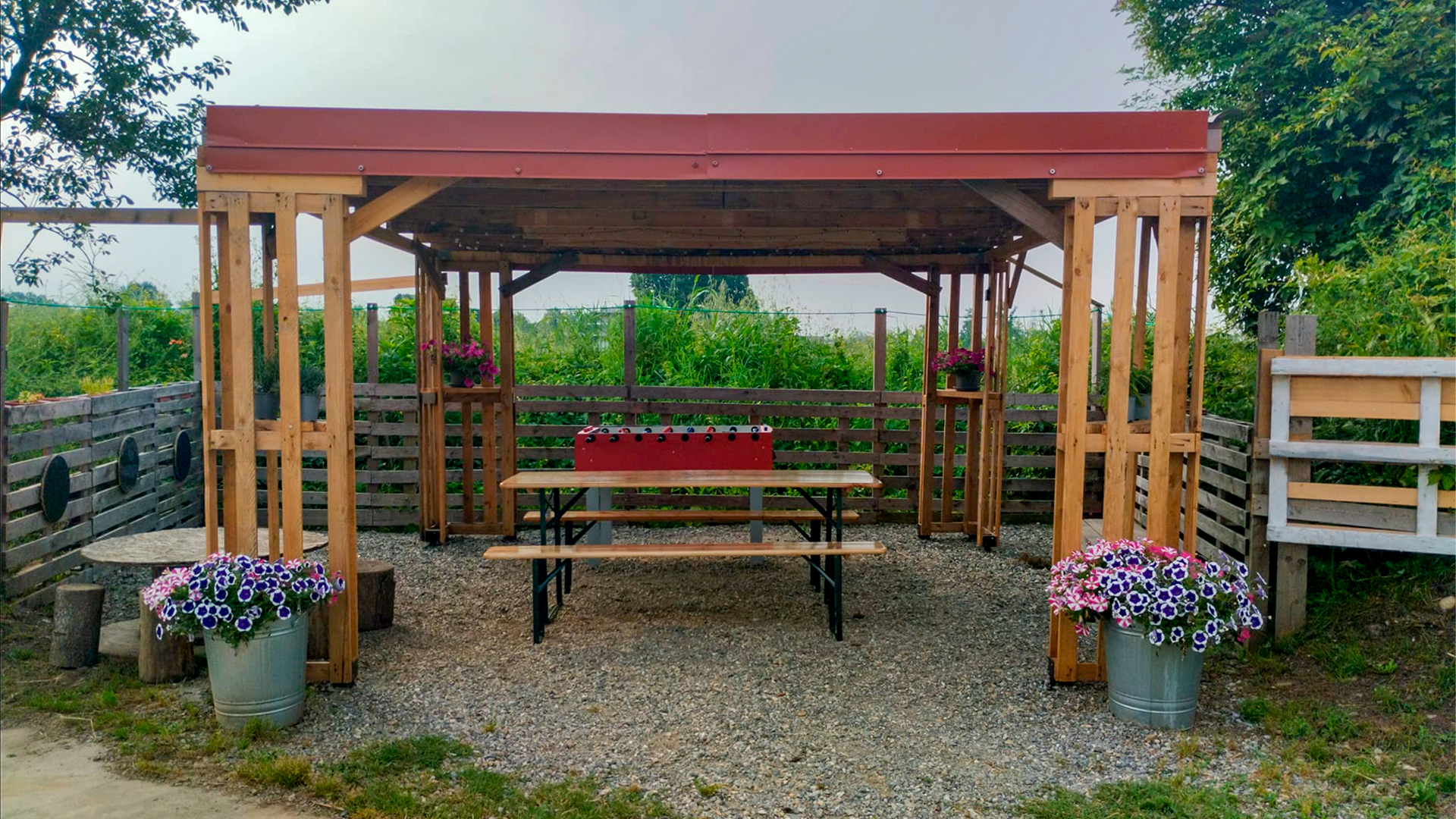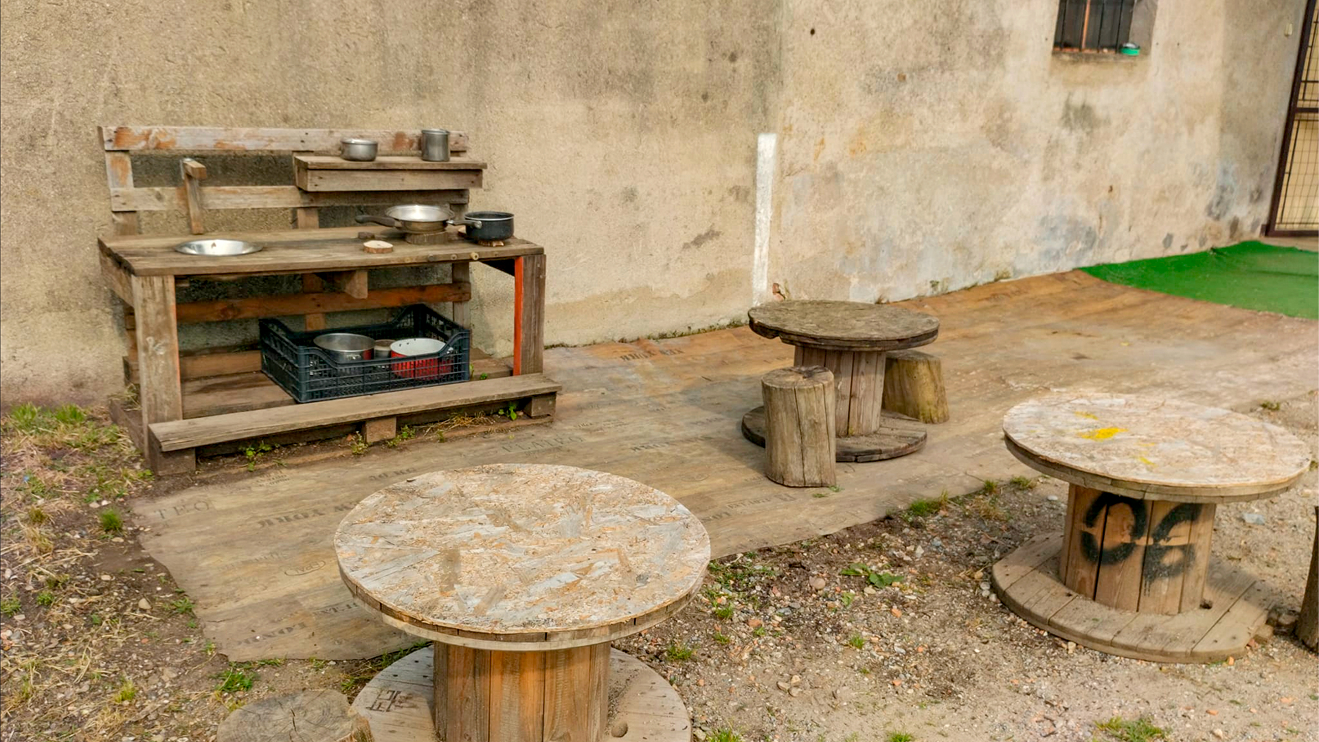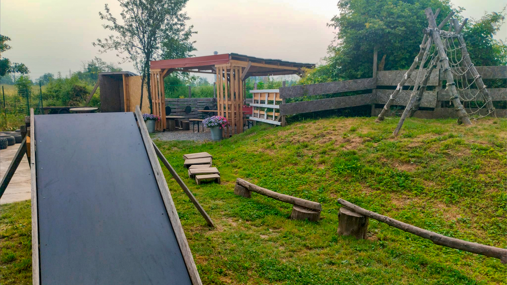 Il cortile è organizzato e fornito di materiali per il gioco libero: tricicli, palle, macchinine, scivoli, casetta, dondoli. D’estate viene attrezzato anche di sabbiere e di piscina e i bambini possono pranzare all’aperto. Inoltre, vista l’insolita collocazione dell’appartamento all’interno di una cascina storica, si possono riscoprire anche altri valori: il contatto con la natura, con la terra: giardinaggio, orto, raccolta di frutta, passeggiate…