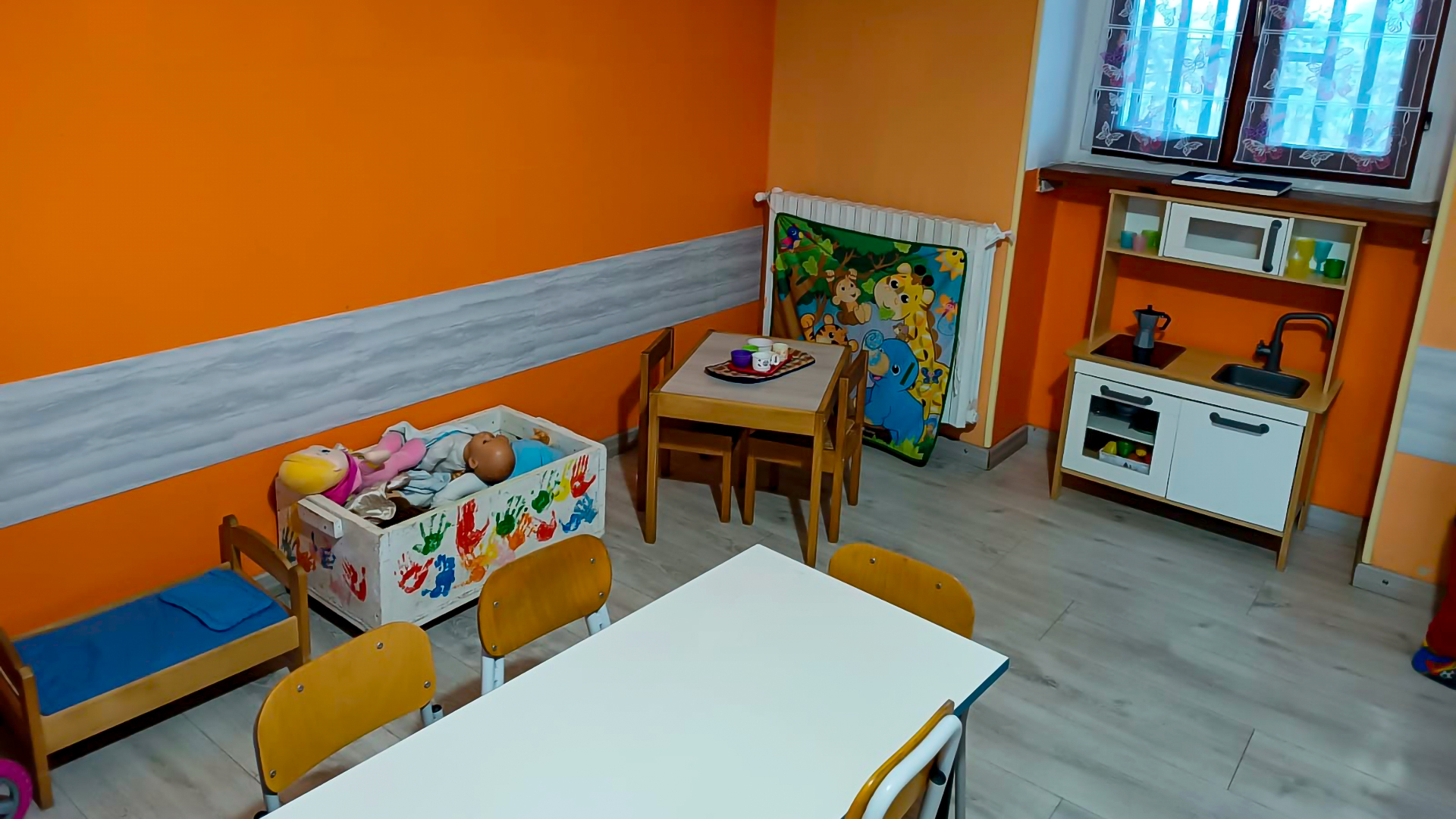 La cucina è abbastanza grande da ospitare i bambini per il pranzo e durante le attività più sporchevoli (tempere, farina gialla, riso soffiato, pasta di pane…).