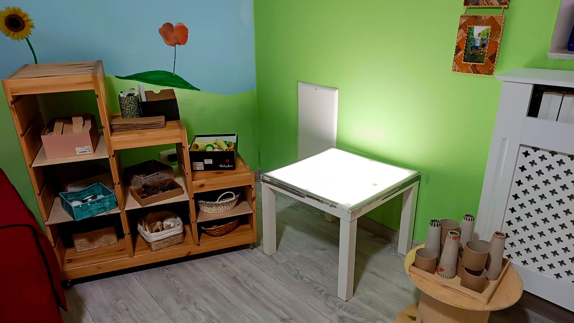In un’ampia sala si può giocare liberamente con i materiali a disposizione dei bambini, si possono fare attività guidate, c’è un angolo morbido per il relax e i giochi a tappeto dei più piccini.